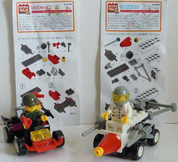 ・わくわくブロック ガチャガチャ 自販機 東京都 足立区 株式会社ビーム まあ、レゴのパチもんみたいなものであるが・・以前別の店で見かけた時には全然別の商品で且つ販売中止の張り紙がしてあって回せなかったとゆー。。 で、今回はx2回でレスキュー車と宇宙戦闘車B、こりゃまたミニカーとしてカウントして良いものかどうか迷うな('c_`;) 人形であるが宇宙戦闘隊員(?)と言うよりはどこかの病院から抜け出してきた患者の様に見えなくも無い。。 何気に恐らくは正式な商品名が印刷されている様である。。 まあ、何と言っても¥200でこのボリュームは貧乏人にはありがたいな。。