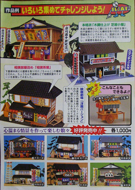 ふたばのホットウィールスレでは自分を特徴付ける為の撮影用ストラクチャーが必要なのではないのかと・・。 一方でバスコレ80の国鉄バスを買って、ああ・・これの為にもファッションホビーもそろそろ作らなきゃいかんなあ。。 ミニカー用のストラクチャーと言えばマジョキットもあると言えばある訳だが・・う~ん。。 だが、待てよ。そう言えば以前購入した居酒屋のプラモ。。ファッションホビーよりもあれを先に作らねばならんなあ・・。 初めて・・では無いのかもしれないが開封してチラシに目を通す。。 ・・何だ?このワクワク感は。。 コンテストも開催されていたとは・・素晴らしすぎる。。 何か追加で欲しくなったので色々と調べる。。アオシマが時代画報シリーズと称して映画劇場と学校は再販しているらしいと言う事・・それとスケールが1/60なのでミニカー用のストラクチャーとして改造している人もいると言う事。。 馴染みのリサイクルショップにしては400円と高額だったが・・それなりの価値は十分に見出せた訳である・・。 ただ、、左手がまだ不自由なんだよなあ・・リハビリもしとるんだが。。 PR |