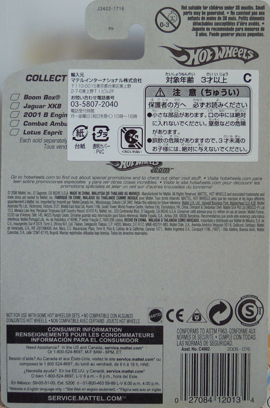 BOOM BOX 2001 B ENGINEERING EDONISと COMBAT AMBULANCE 台紙が切れてるのはキャンペーン応募済みと言う事でオクでは割りとよく見かける。 (ぶら下がり台紙破損のものもあるのかも知れないが) ・BOOM BOX SPY FORCE中最も欲しかったのがコレ。ぶっちゃけ一目惚れで・・ストアオークションに長期ブックマークはしてたのだけど。、結局他のものも手に入る機会があったのでそちらを落札 プリントも妙にカッコイイけどグリーンのウインドゥとクロームメッキの内装とのコンビネーションがツボ過ぎる。。 正面も結構複雑でヨイ。。 ・2001 B ENGINEERING EDONIS プリントはいいのだけど車体のカラーが地味で微妙に車のシルエット的な魅力が伝わりにくい気がしないでもない。。 フロントの開放感+ついでなんでスパイマジシャンと・・ COMBAT AMBULANCEは扱い済みなんで最低限で・・ 多少プリント・カラーリング共に地味だけど、霧の中的な雰囲気と思えば・・まあ、これはこれで・・どうだろ?<え? PR |