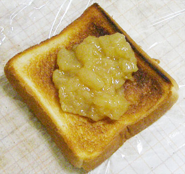 ラップの上にパンを乗せジャムをたんまり盛って巻いて食べる・・パンはちょっと焦げてしまったが美味しいなあ。