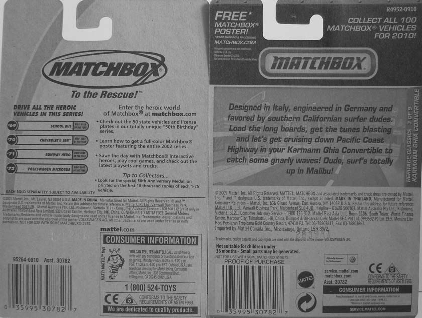 ・VOLKSWAGEN MICROBUS(1/58) 最初に見かけたのはオークションで、その後長期ブックマークして置いた様な記憶もあったのだが・・どうやらそっちはJLの方だったらしいな('c_`;) マッチにも同車があると知ったのはやはりオクだったかWIKIだったか・・よく覚えてないが入荷時には即ポチだったので、その頃にはもう知識として叩き込まれていたのだなあ。。 QOMBEEのモデルらしいのだが・・並べると全然チャウな。。 ・KARMANN GHIA CONVERTIBLE(1/59) コンバーチブル欲しい病ではあるのだが、コレに関してはもうこのカラーが欲しかったのである。 底面刻印は TYPE 14 GHIA CONV'T-1969 スケール見ると VOLKSWAGEN MICROBUS って小さいんだなあ・・。 PR |