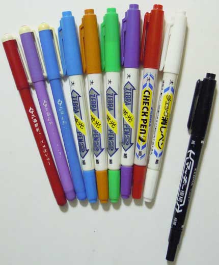 1番右:古のカスタムペン軸用にストックしてあるのだが・・この蛍光ペンも今では絶版らしい。ただマッキーが殆ど同じ仕様なのでシンナー臭さがどうなのか気にはなるが慌てる事も無い。。