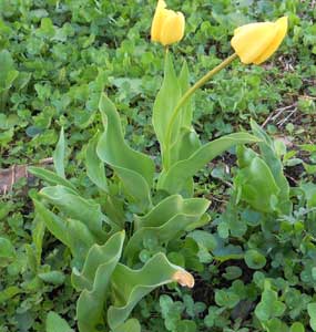 だが今年そのチューリップが黄色の花を付けた。調べるとチューリップは赤と黄色の原種色以外は安定しなくて長い間経つとみんな黄色か赤になってしまうものらしい。