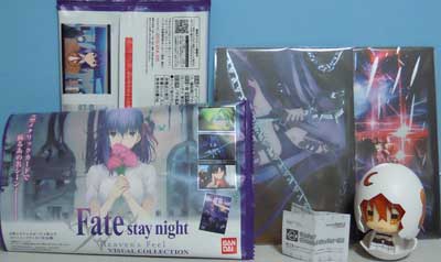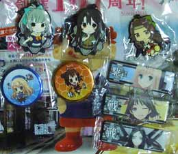 右:キャラアニのセール品。3悪トリオのデイパック、マクロスクリアファイル&トート、エロまん先生ブックカバー、おっぱい缶バッジ(
