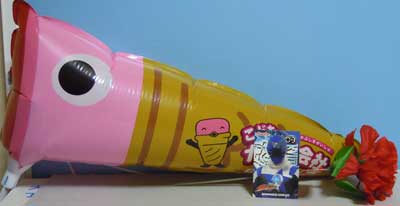 右:フルタのキャンデーのシールとフルタ製品購入者配布のカーネーションとカプリコ鯉のぼり
