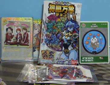 左:故郷通院時に追加買いしたウエハースのヨハネとガルパン水着。ヨハネは曜の次に率が高いのだがオマケ配布物は何時も入手し損ねてるなあ。。からあげクン買ったら裏にマシュが居た。