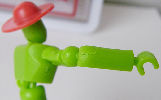 3色セット で、早速組んでみた訳ですが。。 可動範囲は確かに広い。これ位広ければ玩具としても・・まあ納得がいく。。 でも・・割れたorz ・・肘も割れたorz →前に買ったものが素ハメで良かったんで油断してたと言えば油断してた。 カラーによる軟度の違いとかブリスター故のコストダウンの影響もあるのかも知れないのだが・・その辺は詳しくないのでわからにゃい;┐(´~`)┌ で、2個目の組み立て・・各球体ジョイントに1000番紙やすりをホドホドにかけ更に2000番で磨き組み立てる。。 ・・メンドクサス('A`)で完成まで3日所要(爆) 程よい可動と言うかこれ以上やるとユルスギル訳で。。 それでも亀裂orz・・肘もちょっとヤバ気な負荷の痕跡。。 ・・今にしてみればお湯に付けてハメルか予め切り欠けを施して置けば良かったかも知れない('c_`;) ・・イマイチクールではないので悩みドコではある。。 PR |