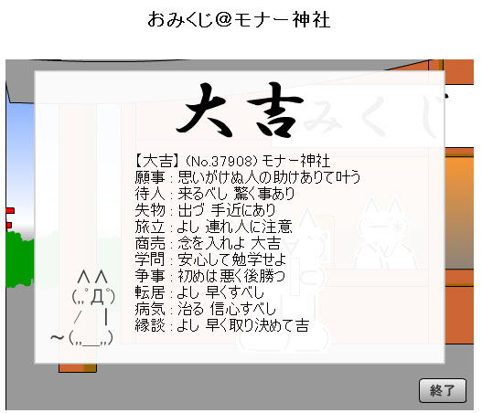 ・・今年ほどダメな元旦は今までに無いorz ・正月の餅 流石に古かったのか中の方が粉末化してた様な('c_`;) ・昼ごはん 前日のホットケーキの余りに3年前の黒みつをかけて('c_`;) ・モナー神社 絵馬 ・・なんてまあ前向きなのでしょう('A`)<大吉だったけど<絵馬消えるんだキャプして置かないとダメだな これから徹夜で計を立てる事にする<オイオイ。 PR |