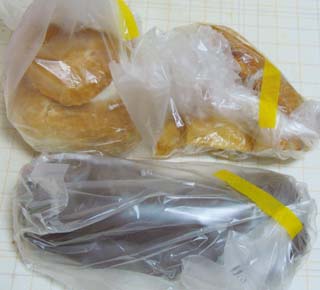 右:過密スケジュールの為、件のパン屋の開店時間に凸。恒例の奥:シャンピニオンと前回食べた手前:全粒粉のパン。左:クロワッサン。