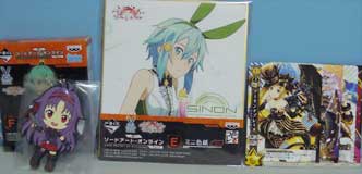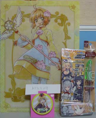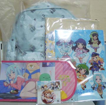 右:キャラアニのセール品。3悪トリオのデイパック、マクロスクリアファイル&トート、エロまん先生ブックカバー、おっぱい缶バッジ(
