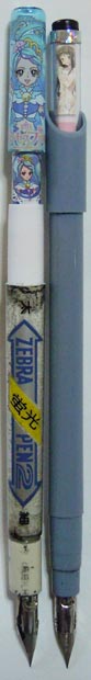 ペン軸のカスタモ。左のキュアマーマイドは投稿ハガキ用のインク専用ペンだが調子に乗ってたら多少裏にインクが染み抜けたな・・。