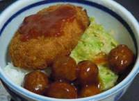 ミートボールコロッケ丼とブルーベリーヨーグルトパンケーキ、、